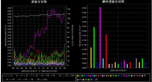 系統(tǒng)能監(jiān)測各通道多達(dá)50次諧波和50次間諧波含量、幅值、角度、功率等數(shù)據(jù),并進(jìn)行本地和數(shù)據(jù)庫存儲,隨時進(jìn)行調(diào)出以表格或曲線方式進(jìn)行分析。